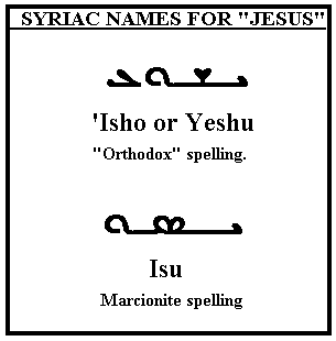 The most striking new fact about Marcionite usage brought out by these treatises is that the Syriac-speaking Marcionites used a different transliteration of the name 'Jesus' from the orthodox. The ordinary Syriac for Jesus is [E-WAH-SHEM-YUD] pronounced 'Isho' by Nestorians but Yeshu' by Jacobites, which is simply the Syriac form of the Old Testament name Joshua. This form 'Isho' was used not only by the orthodox, but also by the Manichees. It was therefore a surprise to find that Ephraim in arguing against Marcionites, and certainly in part quoting from their books or sayings, uses the form 'ISU', a direct transcription of the Greek 'IHSOU (or IHSOUS). As it is always written [WAH-SEMKATH-YUD], never [WAH-SEMKATH-YUD-ALPHA], I suppose the pronunciation intended is IESU rather than ISU, but I have retained Mitchell's ISU (vol. i. p. li), not only for uniformity but also because it was desirable to emphasize the strangeness of the form [WAH-SEMKATH-YUD].