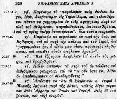 Luke 18:31-33 Marcion "falsified...in its entirety".Luke 19:29-46 "falsified".Luke 20:9-17 "excised".Luke 20:37-38 "excised"
